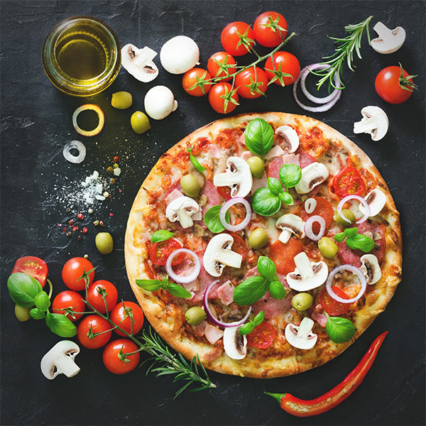 Toppings: Pepperoni, Sausage, Bacon, Beef, Ham, Spinach, Onions, Mushrooms, Peppers, Tomato, Jalapeño Peppers, Banana Peppers, Black Olives, Eggplant, Feta Cheese, Cheddar Cheese & Pineapple